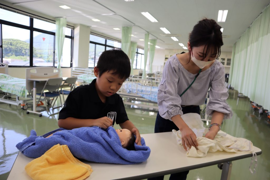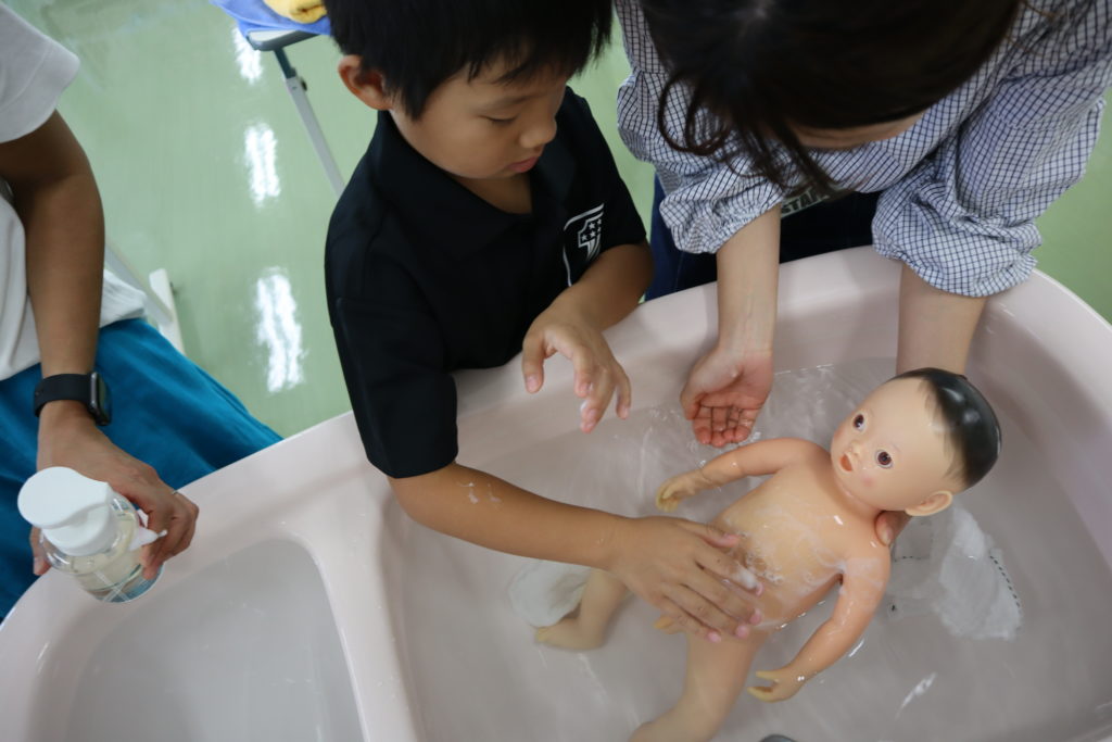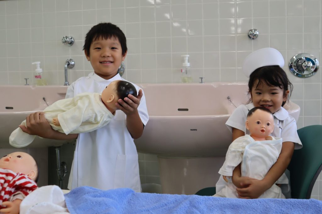 赤ちゃんの沐浴体験や聴診器を使っての心音聴取体験など、楽しみながら一生懸命取り組んでいました。